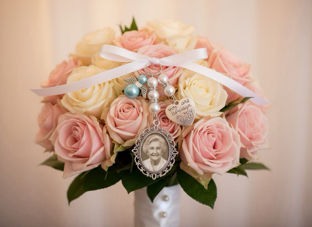 Carry your loved ones with you on your special day with our stunning personalised wedding bouquet photo charm. A touching way to honour those who can't be there in person but are forever in your heart.